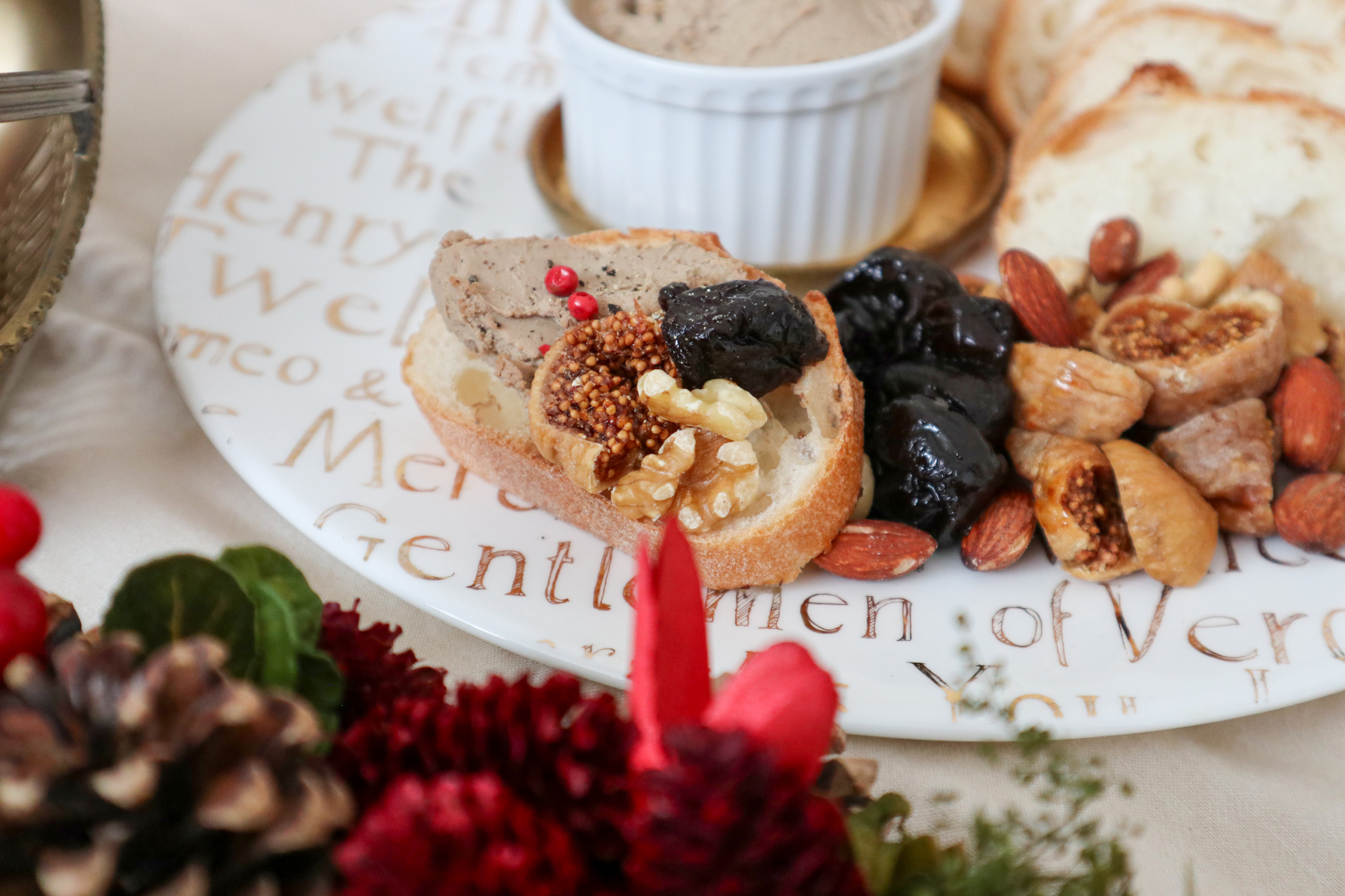 クリスマスディナーの前菜にぴったり!鶏レバーパテにカリフォルニアプルーンやナッツをトッピング。カリッと焼いたバゲットを添えれば、豊かで深みのある味わいに。口の中に幸せが広がりますよ。