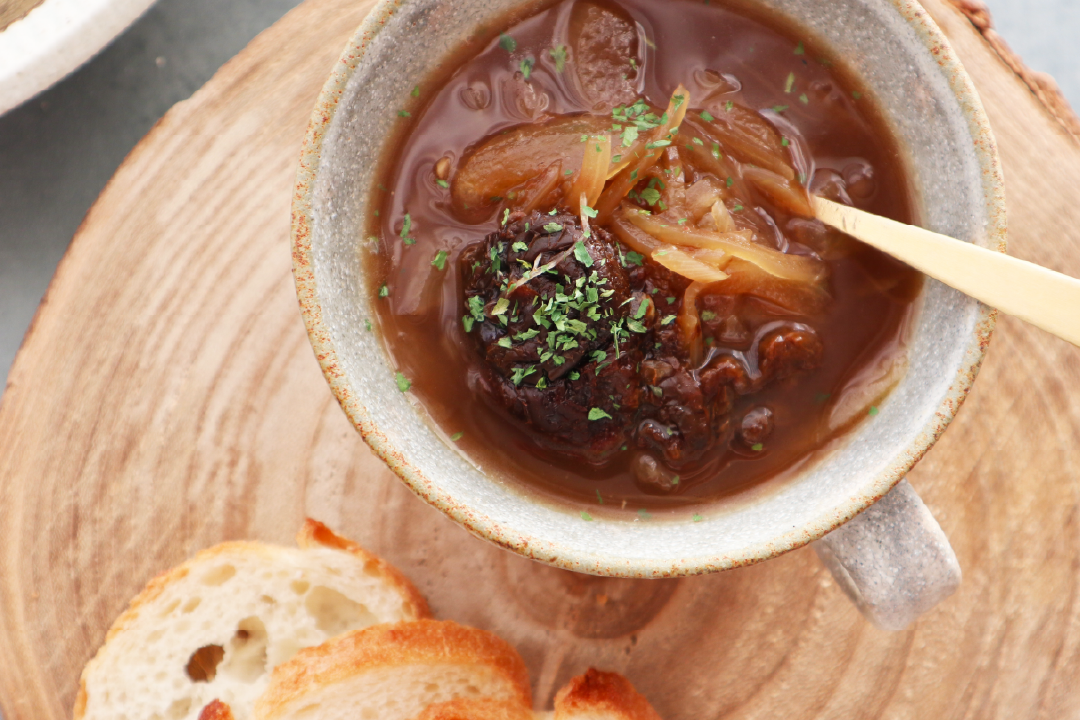 寒い冬の食卓に。丁寧にソテーした飴色たまねぎとカリフォルニアプルーンの旨味でコンソメ要らず。とろりとしたカリフォルニアプルーンを崩しながら、熱々をお楽しみください。