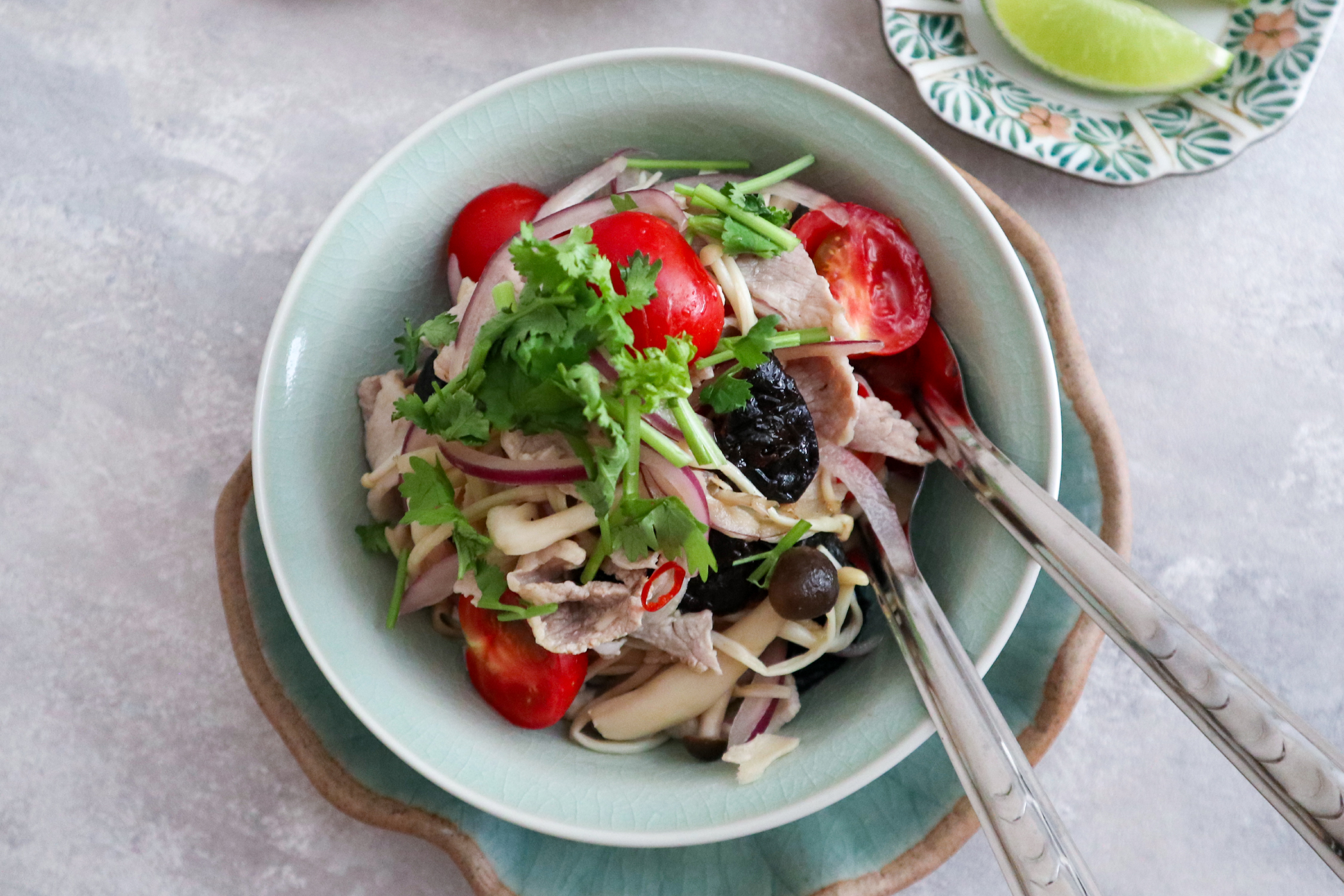 マンネリになりがちなきのこレシピをエスニック風味に!ナンプラーとライムを効かせたピリ辛ドレッシングを具材にあえるだけ。冷蔵庫で保存可能、便利な作り置きにもなります。